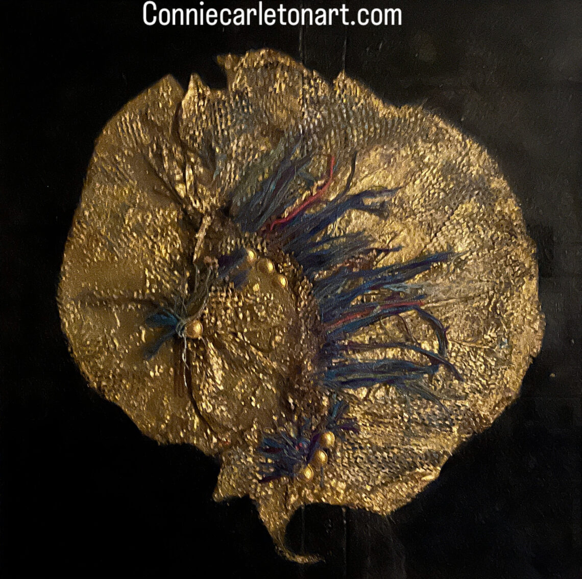Fracture Artist: Connie Carleton — ConnieCarleton Art Website July 9, 2025 / Recycled paper golden abstract representation of a fossil found. This piece is accompanied by thread and bead accents. Size 36 x36 in a beautiful gold frame